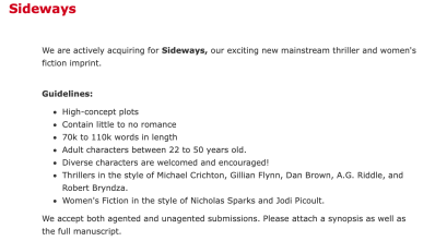 Back in 2012, when I conducted interviews I with romance fiction editors, I was told older women have too much life experience & baggage for rom & were a better fit for Women’s Fiction–and yet there’s an age limit of 50 in Entangled’s Sideways commercial fiction line, which includes Women’s Fiction.